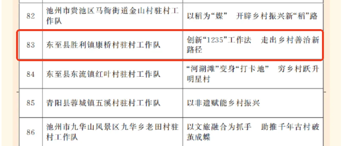 近日,全省第九批选派村百个发展典型案例公布,我院选派驻村干部、东至县胜利镇康桥村第一书记、工作队队长刘加亮同志撰写的《创新“1235”工作法 走出乡村善治新路径》——东至县胜利镇康桥村发展典型案例获评为“全省第九批选派村百个发展典型案例”。